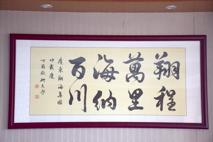 “翔程万里,海纳百川”,佛山市著名书法家亲自提笔,祝贺广东九游会(J9)集团20周年庆典。